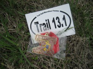 In addition to GU packets and Clif Shots, I bolstered my in-race nutrition with salt caplets for the first time in an attempt to fend off calf cramps that have been a constant problem for me in longer races. I took a salt cap every 40 minutes and washed it down with plenty of water. Although I was fatigued, cramps were a nonfactor until about 10 1/2 miles in when the first slight pinches began to set in on both legs. At one point, my right calf began to cramp hard and I was forced to stop and press my heel down against a rock to stretch it out. The final 2 1/2 miles were a mixture of walking and jogging. Thanks to encouraging words from some fellow runners who pulled me along, the final few miles ticked away and I soon popped out of the woods, back onto the gravel road and made it up the hill to the finish line where Bad Ben stood smiling and ready to greet finishers with a firm handshake, some congratulatory words — and a hard-earned finisher’s medal.