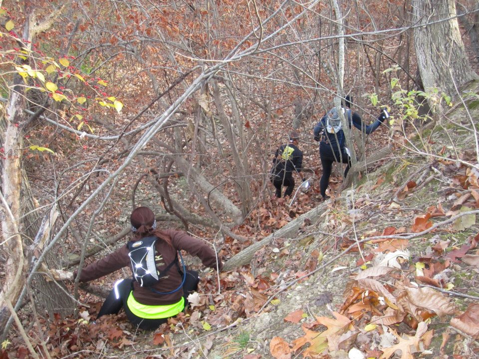 From there, we split up. Mindy has a flight to catch, so she, Aaron and Dan bolt ahead while Rick and I – both hurting a bit – opt to take it easy for the final six miles. All that remains is some moew bushwhacking, a rope climb about 20 feet down the “fiscal cliff,” and a mixture of single-track and road.