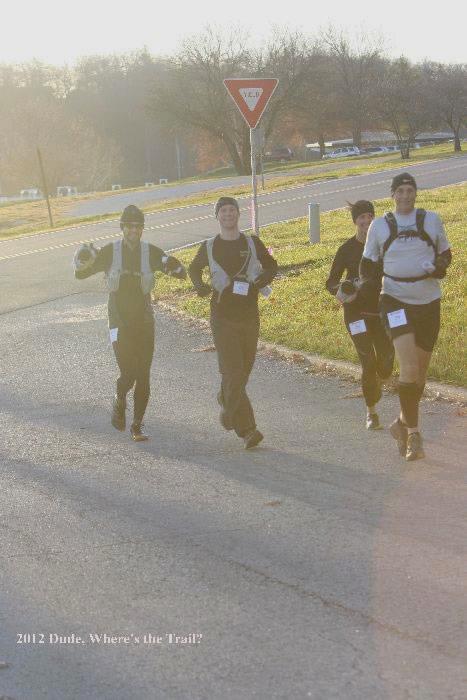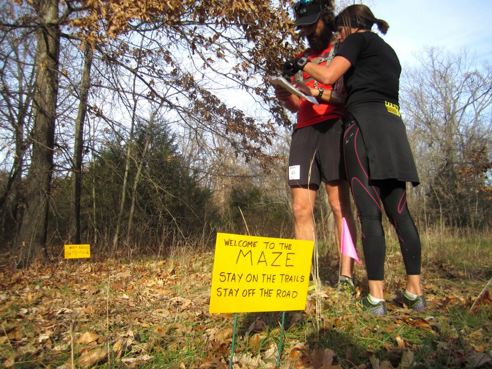 Despite the staggered starting times, our team – Mindy, Rick Troeh, Aaron Norman and I – pass all but a few early starters during the first mile and a half. We’re moving briskly, shuffling through ankle-deep leaves and hopping over logs (“Most were placed by Mother Nature and have no meaning,” Lou notes in the race instructions, “but the ones weighing several tons were placed by me to confuse you.”). We’ve been running for about 15 minutes when we realize we’ve already missed a turn and gone off-course.