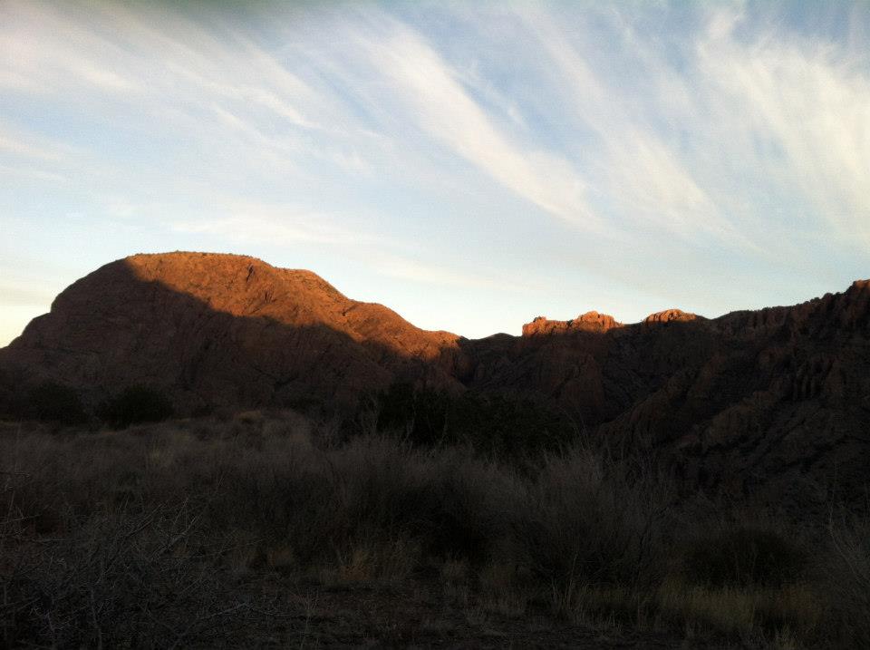 After about 40 minutes of sun-seeking, we were rewarded for our efforts as the rock faces to the west began to glisten, just a tiny bit at first, and then the whole thing. After about 10 minutes, all of Chisos was painted in sunlight.
